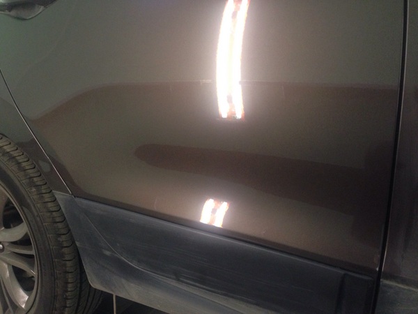 Вмятина на двери водителяВо-первых: это позволит быстро устранить дефект, во-вторых: Вам не придетс перекрашивать часть кузова автомобиля, а в-третьих: это намного дешевле, чем та же покраска.